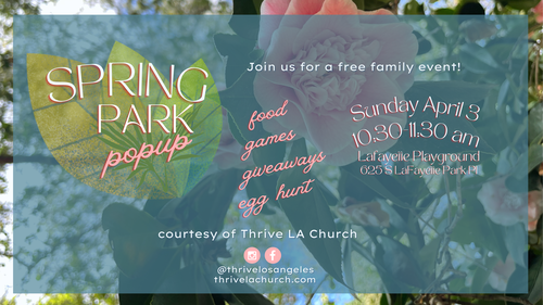 Hop on over to a free family event at Lafayette Recreation Center Playground Sunday April 3rd from 10:30-11:30 am! We’ll have food, games, giveaways, and egg hunts courtesy of Thrive LA Church. Send this link to a friend you want to meet up with, and we’ll see you there!